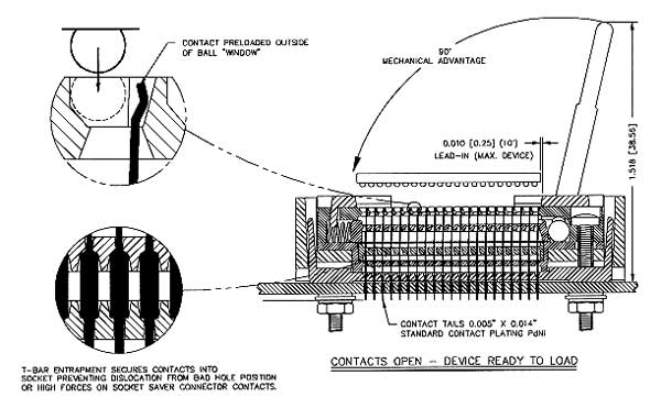 LOADING THE PACKAGE INTO SOCKET STEP ONE Rotate the cam handle or rocker arm to the open position. If the contacts are not open when loading, damage will occur to the tips of the contacts. The rocker arm closest to the end of the socket should be down, or the cam handle vertical. STEP TWO Place the package with the correct predetermined orientation into the socket. Confirm that the package is properly seated by gently pressing on all four corners of the package. STEP THREE Rotate the cam handle or rocker arm to the closed position. Do not apply any pressure to the top of the package while closing the contacts. If pressure is applied, it is possible solder mask will be scraped onto the contact, causing an insulation barrier at the solder ball. If this does occur, clean the contacts with a vacuum brush.