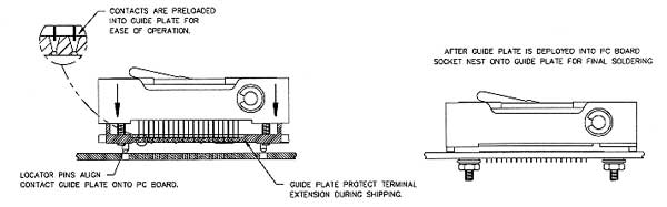 Burn-in Board or Printed Circuit Boar STEP ONE If Black Contact Protector / PCB Guide Plate on bottomside of the socket is not extended, gently pull it down or firmly tap socket on flat surface until the guide plate is flush with the bottom of the contact tails. Avoid touching the grid area of the socket while extending the PCB guide plate flush with the contact tails. STEP TWO Insert the locating pins on the Black Contact Protector/PCB Guide Plate into their matching holes on the PCB. STEP THREE Gently and evenly press down on the socket until it is seated on the BIB or PCB. STEP FOUR Locate the four socket screws on the backside of the BIB or PCB.Use the mounting hardware, consisting of four (4) Nylatron washers, four (4) flat washers, four (4) lock washers, and four (4) hex nuts, in that order, to secure the socket to the PCB or BIB. It is important that the Nylatron washer is mounted next to the PCB or BIB. STEP FIVE Gently tighten the hex nut until the split lock washers are compressed. However, if the split lock washers are difficult to see, one to two (1-2) inch/lbs of torque will be sufficient. Be cautious not to overtighten the hex nuts or damage to the BIB or PCB may occur. STEP SIX Rotate the cam handle or rocker cam to the open position before soldering contacts. STEP SEVEN Solder. STEP EIGHT Remove labels from the top of the socket.